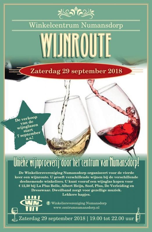 Numansdorp – Het is bijna zover zaterdag 29 september van 19.00 uur tot 22.00 uur is weer de jaarlijkse wijnroute door het centrum van Numansdorp. Vanaf 7 september, 13.00 uur, zijn de glazen van de wijnroute 2018 te koop!! Je bent er toch ook weer bij op 29 september?!