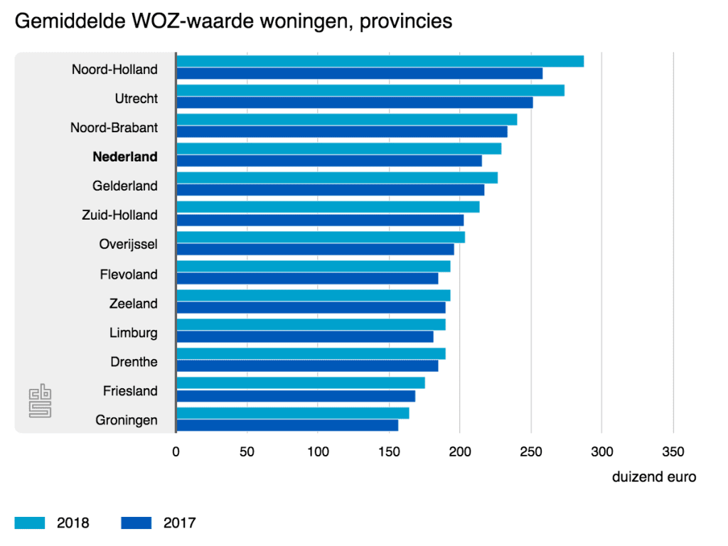 De stijging van de gemiddelde WOZ-waarde was in Zeeland het kleinst, maar toch nog ruim 2 procent tot 194 duizend euro. In Noord-Holland steeg de gemiddelde woningwaarde het meest met ruim 11 procent naar 288 duizend euro. Dit is tevens de hoogste gemiddelde waarde van alle provincies. Ook in de provincie Utrecht lag de toename met bijna 9 procent hoger dan het landelijk gemiddelde. In de provincie Groningen is de gemiddelde woningwaarde met 165 duizend euro het laagst.