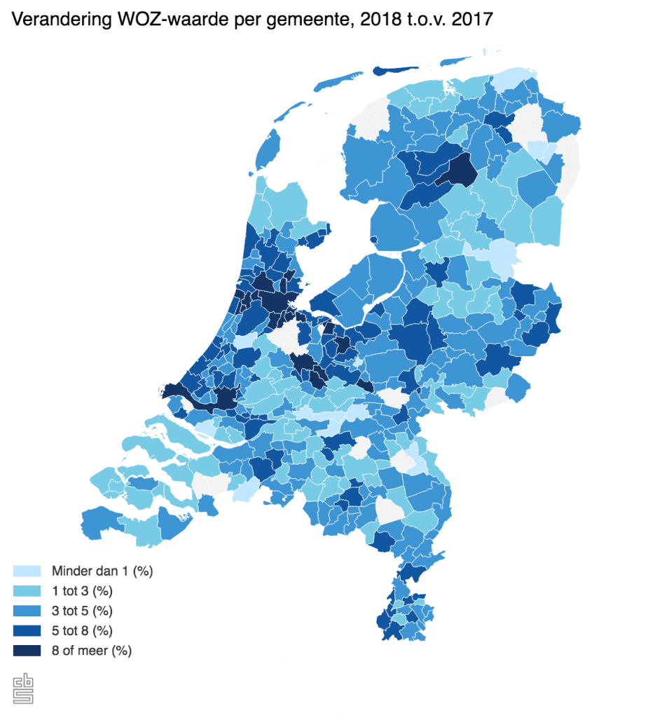 De gemiddelde WOZ-waarde van woningen is in 2018 voor het derde jaar op rij gestegen. Op 1 januari 2018 bedroeg de gemiddelde WOZ-waarde 230 duizend euro per woning, 6,5 procent meer dan een jaar eerder. Dit meldt het CBS op basis van nieuwe cijfers.