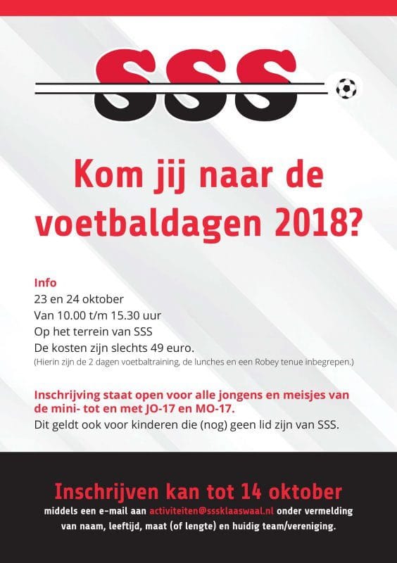 Klaaswaal – In de herfstvakantie 2018 organiseert SSS Klaaswaal op dinsdag 23 en woensdag 24 oktober voetbaldagen op het terrein van SSS.