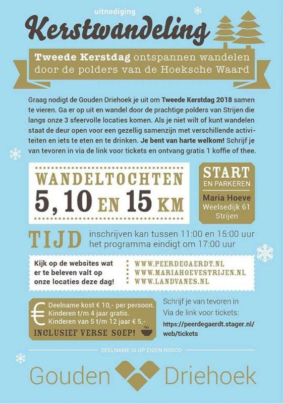 HOEKSCHE WAARD – De Gouden Driehoek van de Hoeksche Waard verzorgt ook dit jaar weer een kerstwandeling. Deze wandeling vindt plaats op woensdag 26 december 2018. Start bij Maria Hoeve Strijen ( tussen 11.00 en 15.00 uur)