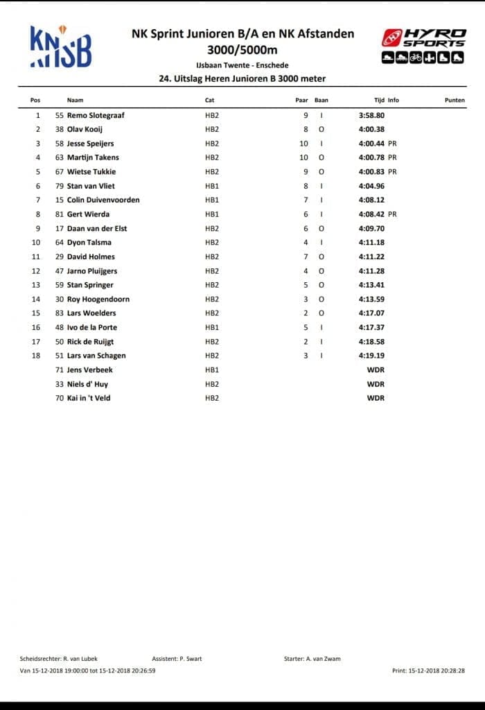 In een seconden strijd die past bij een sprint afstand werd Jesse Speijers 3e in een tijd van 4.00.44 . Remo Slotegraaf greep de nationale titel bij de heren junioren B en dook als enige onder de vier minuten (3.58.80). “Ik had ook graag een tijd onder de 4 minuten gereden, ik zit al een tijdje tegen de grens aan te hikken, maar ik ben tevreden met deze tijd” vertelt Olav.