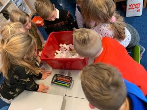 Nadat de juf allemaal plastic afval had verzameld, maakten de kinderen vervuild water na in het klein. Daarna gingen ze in 3 groepen praten over hoe verschillende mensen, dieren, sprookjesfiguren het plastic-probleem zouden kunnen oplossen. Als derde gingen de kinderen aan de gang met waardeloos materiaal. De opdracht was: Maak een apparaat wat het plastic op kan ruimen. Dit kon uitgeprobeerd worden in onze eigen plasticafvalbak.