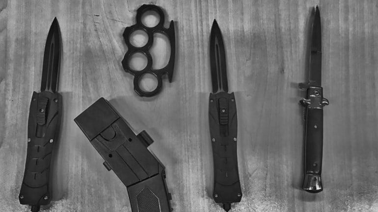 Agenten schakelden de hondengeleider in en wachtten de komst van de Dordtenaar af om de hoek van deze woning in Nieuw-Beijerland. Wat vervolgens bij de verdachte werd aangetroffen, was volgens de politie “niet mis”. Hij had meerdere messen, een taser en een boksbeugel bij zich.