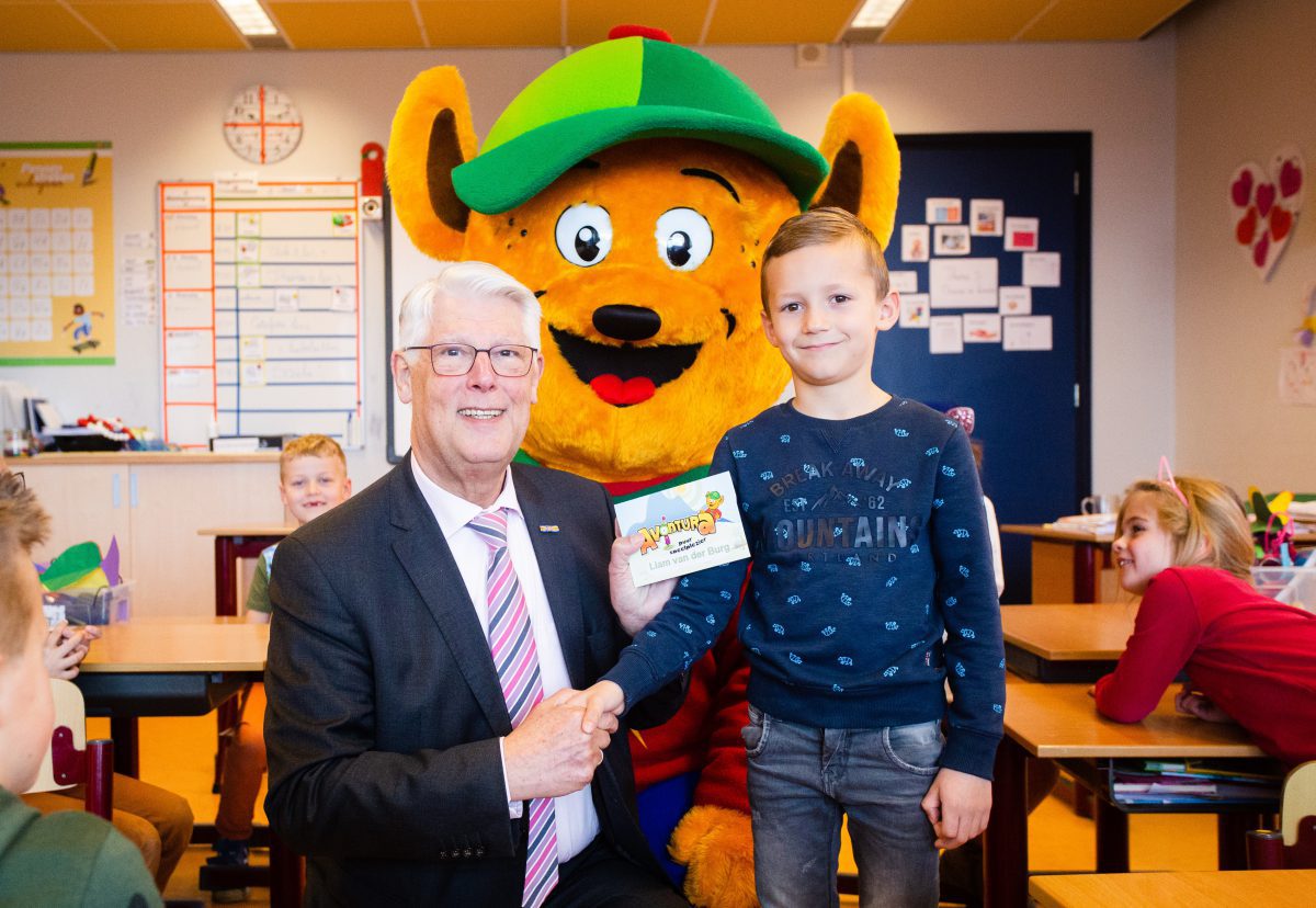 STRIJEN – Groep 4A van basisschool De Meerwaarde in Strijen werd vandaag verrast met een bezoek van wethouder Piet van Leenen. Hij kwam niet alleen, maar samen met Okke, de mascotte van Avontura. Dit had allemaal te maken met de prijs die de zevenjarige Liam van der Burg won met de tekenwedstrijd ‘Hoe mooi is jouw dorp?’.