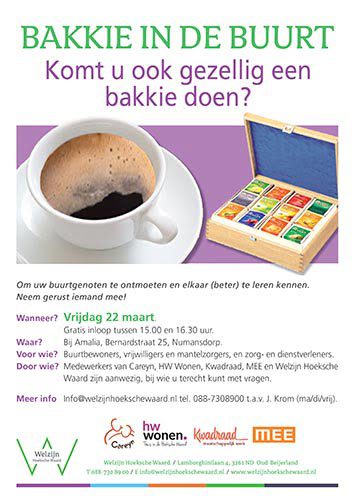 Numansdorp – Op vrijdag 22 maart is er een gezellige middag om elkaar uit de buurt beter te leren kennen. Deze nieuwe activiteit draagt de naam Bakkie in de buurt. Iedereen is van harte welkom: buurtbewoners, mantelzorgers, vrijwilligers, maar ook professionals werkzaam in de wijk. Ook zijn er een aantal zorg- en dienstverleners aanwezig bij wie men terecht kan met (hulp)vragen. Uiteraard staat de koffie of thee, met wat lekkers erbij, voor u klaar!