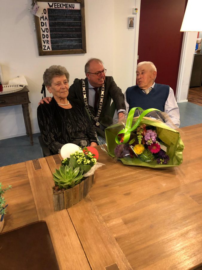De burgemeester bezocht het echtpaar Barth in zorgcentrum Immanuël in ‘s-Gravendeel. Namens het gemeentebestuur feliciteerde hij hen met het mooie jubileum en overhandigde hij een boeket bloemen.