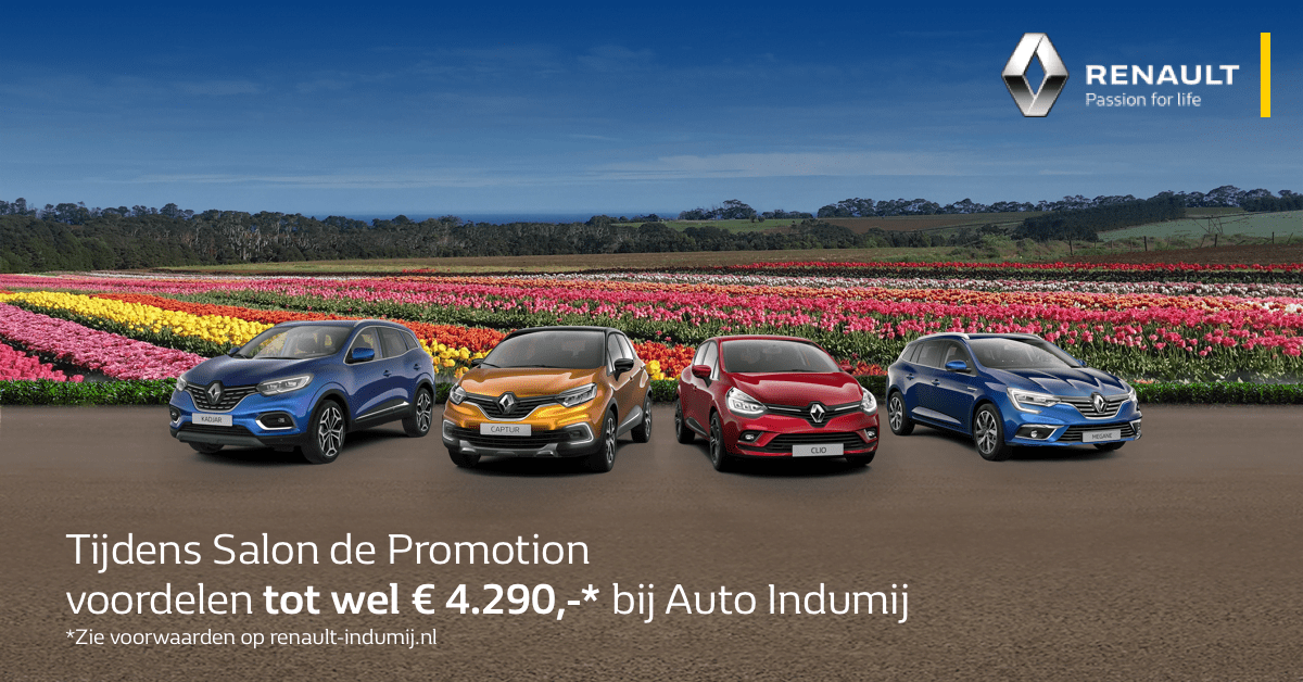 Leve de Lente! Het is Salon de Promotion bij Auto Indumij. Tijdens deze actieperiode bieden wij enorm veel voordeel op onze voorraad nieuwe Renault modellen.Of je nou kiest voor een Clio, Captur of Mégane Estate, het voordeel loopt in de duizenden euro’s!
