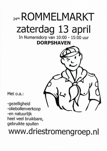 NUMANSDORP – Scouting Driestromengroep organiseert as. Zaterdag 13 april van 10.00 tot 15.00 uur haar jaarlijkse rommelmarkt bij de dorpshaven in Numansdorp.Behalve veel spulletjes wordt er ook goed voor de innerlijke mens gezorgd.
