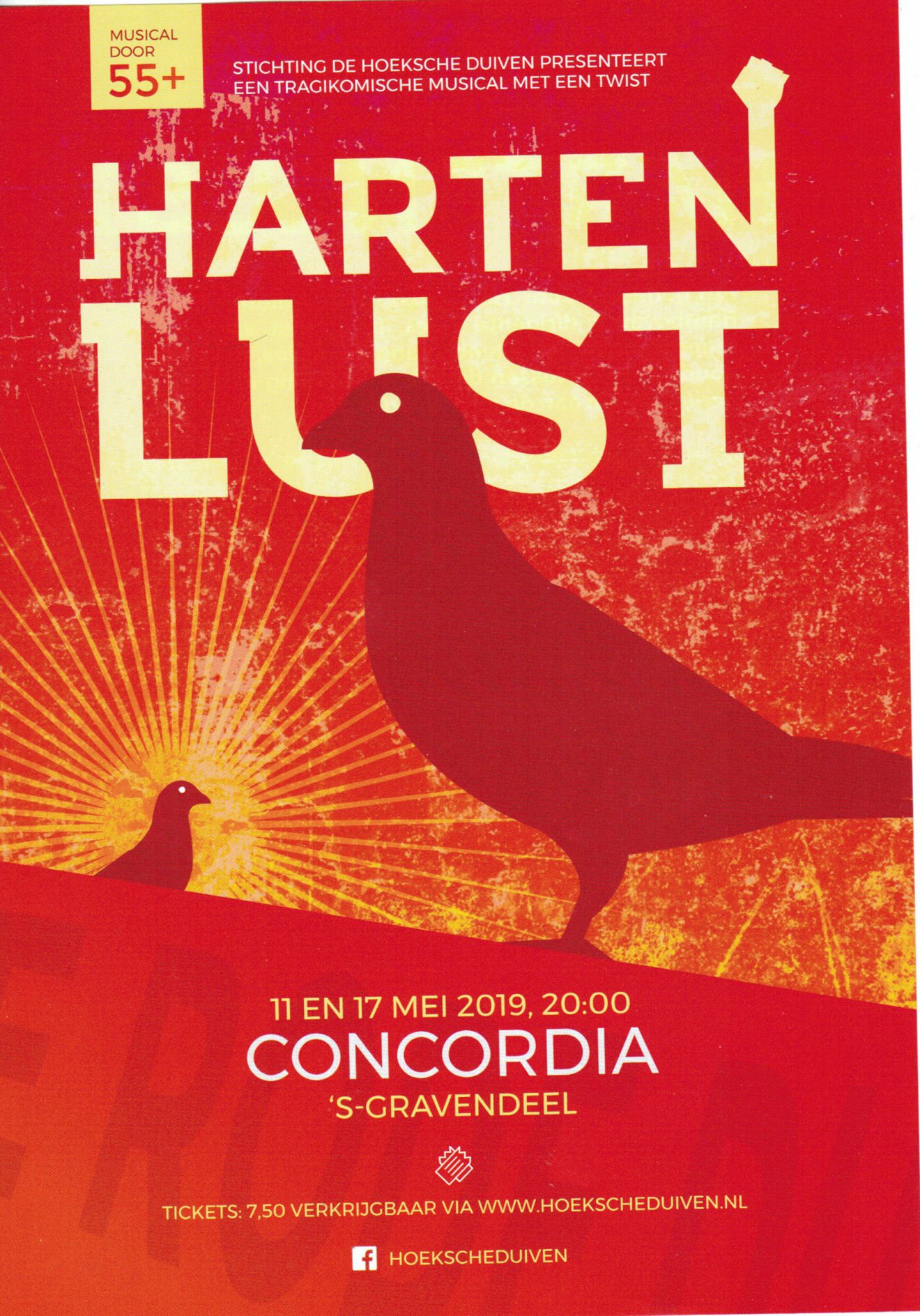 HOEKSCHE WAARD – Stichting De Hoeksche Duiven brengt de musical terug in de Hoeksche Waard. Op zaterdag 11 en vrijdag 17 mei brengt het senioren-musicalgezelschap de tragikomische voorstelling ‘Hartenlust’ in partycentrum Concordia in ’s-Gravendeel op de planken.