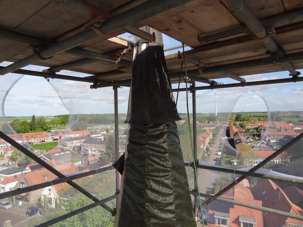 Voor het uitvoeren van deze werkzaamheden is door de gespecialiseerde restaurateur Koninklijke Woudenberg uit Ameide een stelling gebouwd, de kerktoren van Piershil maakt een ingepakte indruk. En dat levert mooie plaatjes op!