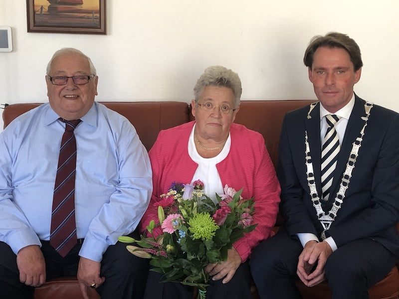 HOEKSCHE WAARD – Maandag 14 mei was het 60 jaar geleden dat de inmiddels 82-jarige meneer J. Geesing met zijn 82-jarige echtgenote mevrouw H. Geesing-Damen in het huwelijksbootje stapte. Locoburgemeester Paul Boogaard ging op visite met een mooie bos bloemen en feliciteerde het echtpaar namens het gemeentebestuur.