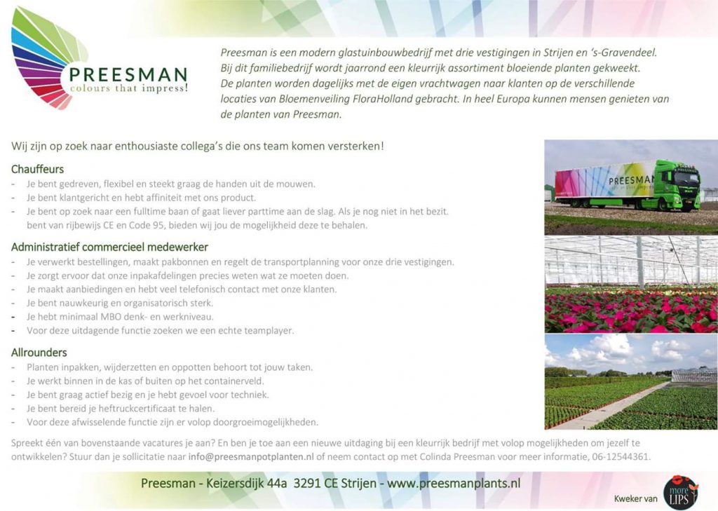 Preesman is een modern glastuinbouwbedrijf met drie vestigingen in Strijen en ‘s-Gravendeel. Bij dit familiebedrijf wordt jaarrond een kleurrijk assortiment bloeiende planten gekweekt. De planten worden dagelijks met de eigen vrachtwagen naar klanten op de verschillende locaties van Bloemenveiling FloraHolland gebracht. In heel Europa kunnen mensen genieten van de planten van Preesman.