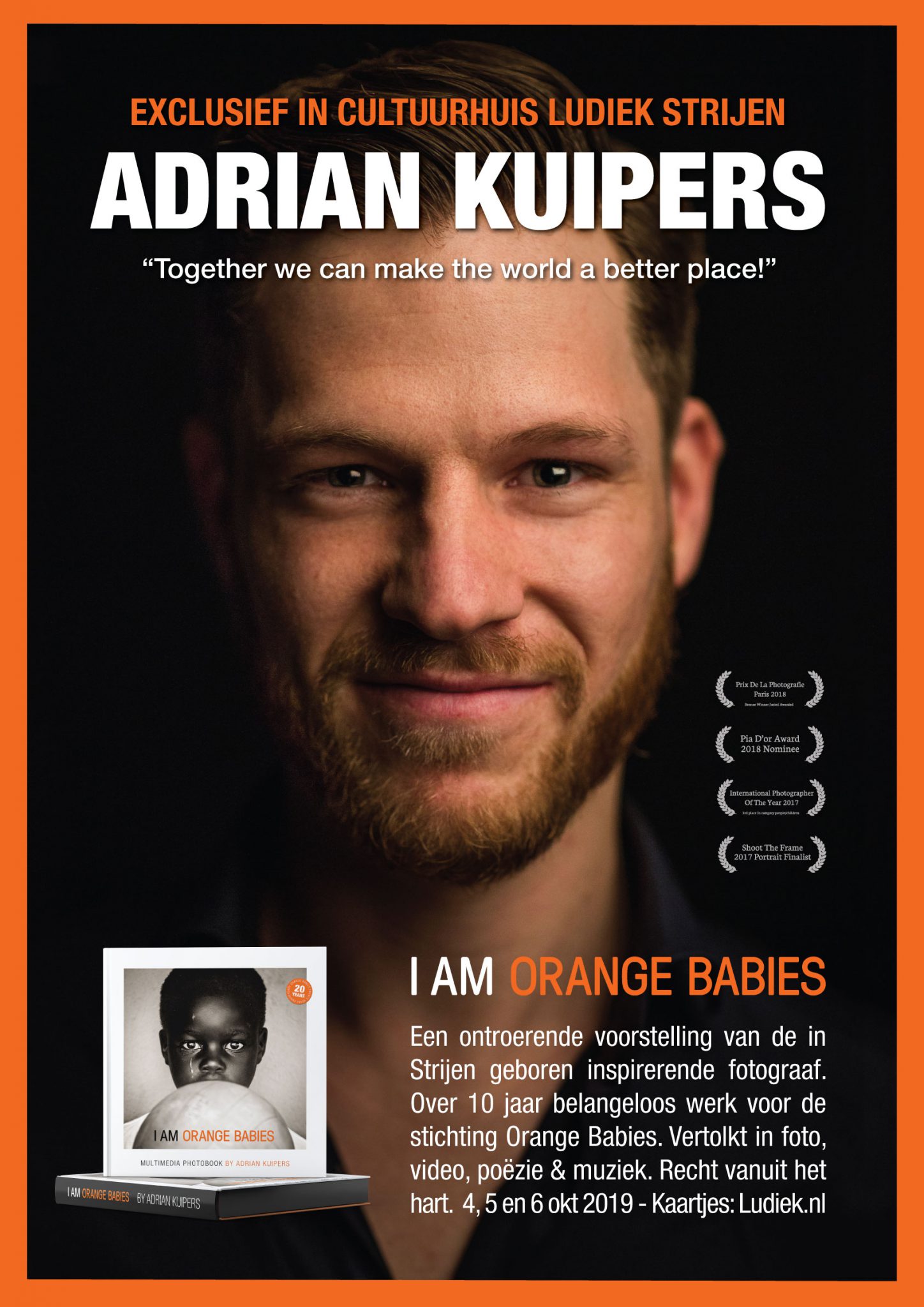 Na 10 jaar reizen voor Orange Babies heb ik mijn werk gebundeld in een boek. Daarnaast heb ik een voorstelling gemaakt waarin ik de verhalen bij mijn foto’s vertel. Ook speel ik in de voorstelling piano en zing ik de nummers die ik naar aanleiding van het werken voor Orange Babies heb geschreven. Vóór de voorstelling is er een dinerbuffet, met liefde gemaakt door vrijwilligers en gesponsord door lokale bedrijven. Na de voorstelling is er de gelegenheid om een foto of boek te laten signeren. De gehele opbrengst van deze voorstellingen, in combinatie met het ‘Dinner of hope’, gaat naar Orange Babies.