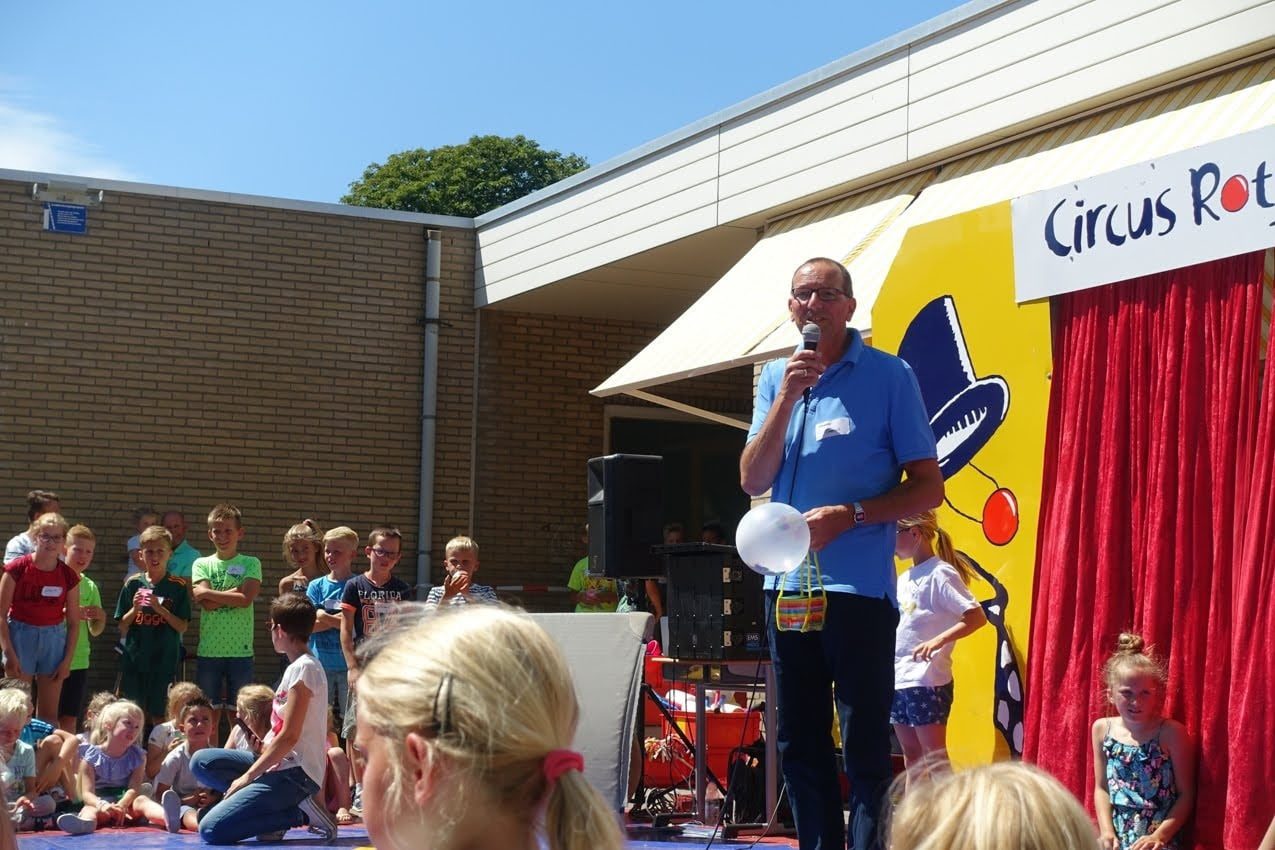 Op vrijdag 5 juli vierden de kinderen het zomerfeest op school. Onder leiding van Circus Rotjeknor studeerde de kinderen verschillende acts in. Later die middag sloten ze de dag af met een echte voorstelling met als ere gast: Meester Gerrit. In het geheim schoven zijn vrouw, kinderen, ouders en schoonouders aan om van de voorstelling te genieten. Voor de voorstelling waren er ook veel, eenzame, ouderen uitgenodigd. De slot act was wel heel speciaal. Een spandoek met een boodschap voor de meester. En op donderdag 11 juli werd de meester door zijn vrouw “ontvoerd” naar cbs ‘De Hoeksteen’ omdat deze collega’s niet bij de receptie aanwezig konden zijn en wel gepast afscheid van hem wilde nemen. Gerrit is namelijk ook jaren werkzaam geweest op deze school.