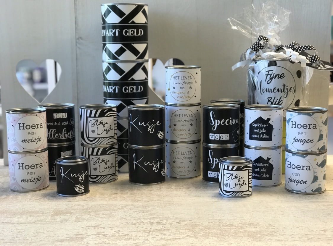 STRIJEN – Nieuw Bij Marie zijn deze superleuke kado blikken. De blikken zijn leeg en verkrijgbaar met verschillende teksten.