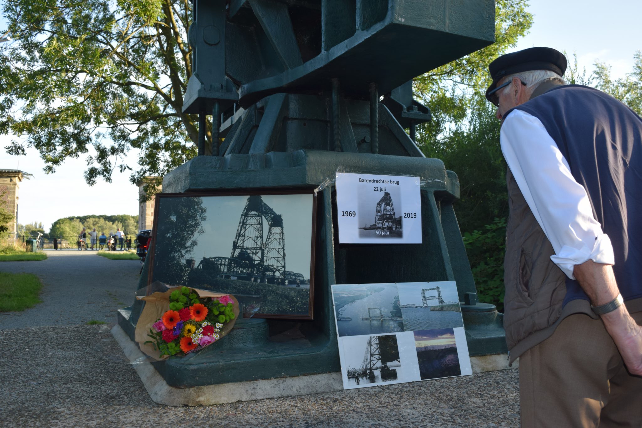 Barendrecht – Ongeveer twintig mensen waren naar het monument van de Barendrechtse brug gekomen. gelegd bij het monument voor de Barendrechtse brug. Op 22 juli was het precies 50 jaar geleden dat de brug werd gesloten. “Dat gebeurde heel stilletjes,” zegt Arco van de Ree, ”Daarom vond ik het hoog tijd voor een postuum eerbetoon.” Samen met een paar ander brugliefhebbers legde hij bloemen bij het monument.