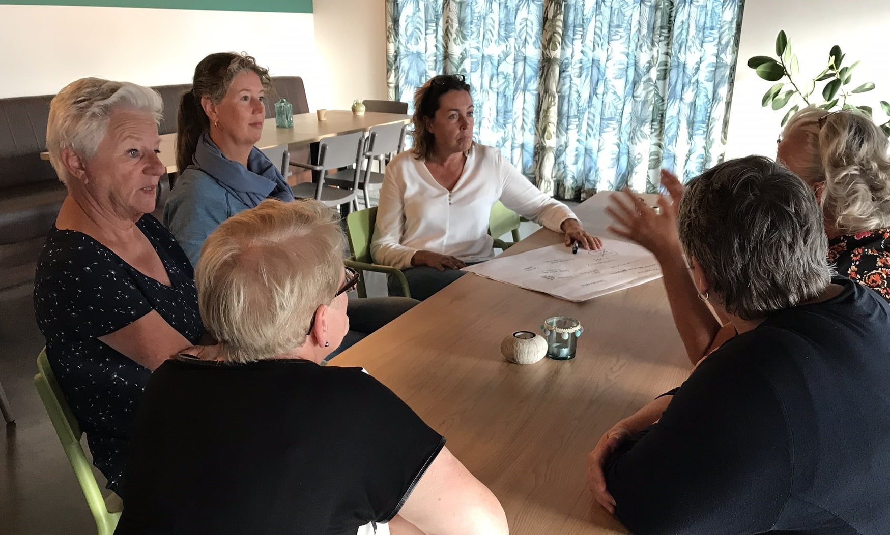 Op de foto: vrijwilligers en coördinator van de Hoeksche Huiskamer Numansdorp in gesprek over gastvrijheid.