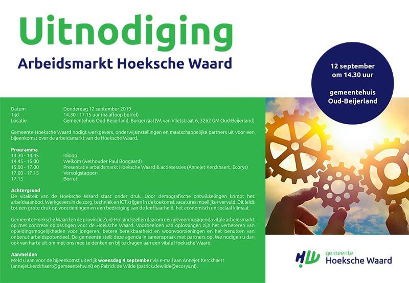 Werkgevers in de zorg, techniek en ICT krijgen in de toekomst vacatures moeilijker vervuld. Gemeente Hoeksche Waard en de provincie Zuid-Holland zoeken daarom naar oplossingen hiervoor. Denk bijvoorbeeld aan het verbeteren van opleidingsmogelijkheden voor jongeren, betere bereikbaarheid en woonvoorzieningen en het benutten van onbenutarbeidspotentieel. We willen in samenspraak met partners naar deze oplossingen kijken. We nodigen u dan ook van harte uit om met ons mee te denken en bij te dragen aan een vitale Hoeksche Waard. Kijk op www.gemeentehw.nl voor het programma van de bijeenkomst.