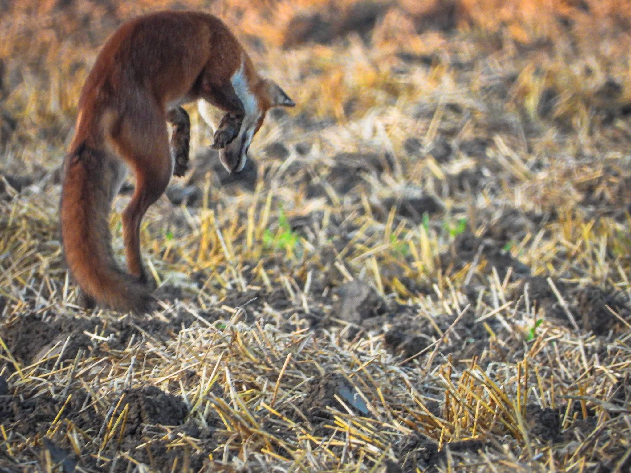 Midden in het weiland! Ik zei letterlijk HOE DAN?! Op de Veluwe is het mij nog niet gelukt en dan hier wel? Camera lag gelukkig naast me op de stoel, ben zachtjes gestopt iets verder en heel voorzichtig uitgestapt. Heel even kreeg ik de kans om foto’s te maken! Het licht was nog wat donker maar het ging redelijk. De Vos was opjacht naar ontbijt. Na het vangen van zijn prooi rende hij snel weer een maisveld in. De Hoeksche Waard blijft verrassen!
