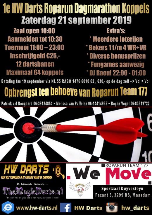 Maasdam – Het Roparun team 177 We Move is een samenstelling van mensen uit de dorpen Heineoord, Gravendeel, Maasdam, Puttershoek, Strijen, Mijnsheerenland en Oud Beijerland.Op 21 september organiseert het team voor het goede doel een dart marathon in de sporthal Duyvesteijn van 11.00 tot 23.00 uur.