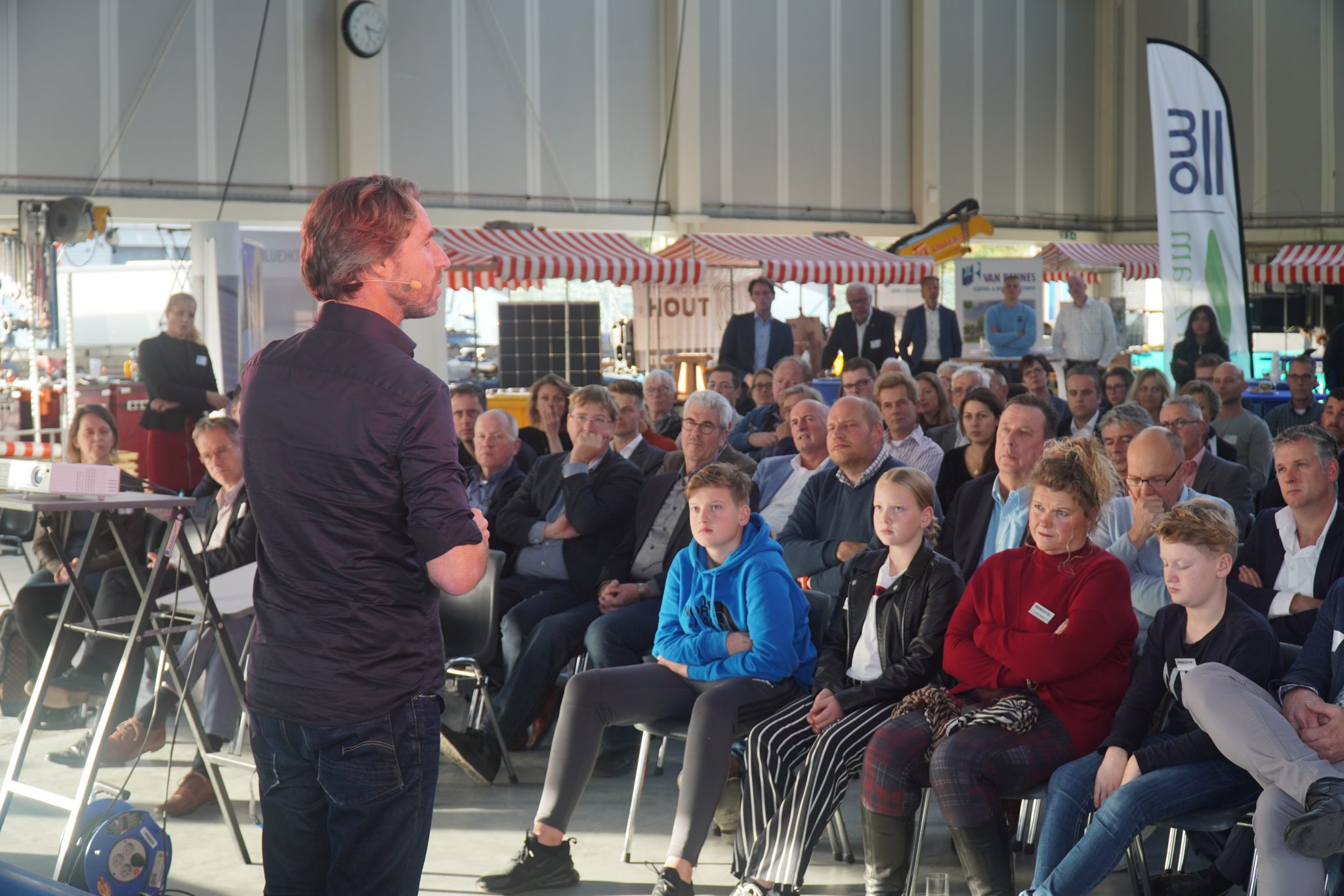 Een positief spannend thema, vond wethouder Huibert Steen die de bijeenkomst opende. ,,Met zonnepanelen verdien je aan duurzaamheid. Hoe zit dat met plastic vervuiling?” opende hij de discussie door letterlijk een balletje op te gooien. ,,De bal ligt niet bij de overheid, maar in het midden. De creativiteit zit niet bij de overheid, die verwacht ik van jullie, van de ondernemers, ” sprak Steen. Als voorbeeld noemde hij Dirk Reedijk, de gastheer van de middag.