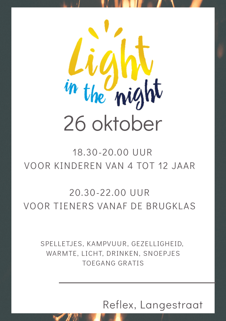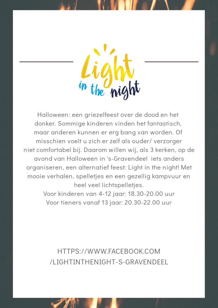 ‘s-Gravendeel – Nu het weer herfst is, komt ook Halloween er weer aan. Maar wat als je niet van griezelen houdt? In ‘s-Gravendeel hebben de 3 kerken een alternatief bedacht; light in the night. Een feest van licht.Voor kinderen van 4 tot en met 12 jaar een feest vol spelletjes, knutselen, een verhaal en gezelligheid.