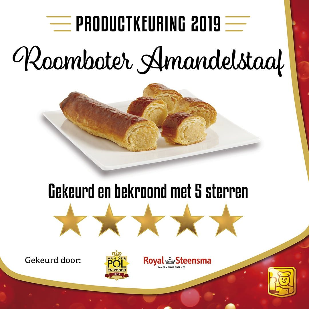 Alwin de Koning: “Dat is precies de reden waarom we meedoen aan de competitie van het Gilde. Daarbij sturen we een product in, dat wordt gekeurd door deskundige keurmeesters die vooral kijken of het proces goed gelopen is. Bij de amandelstaven kijken ze of er genoeg spijs in zit, of die mooi in het bladerdeeg gerold zit en of de staaf goed gebakken is. Als er verbeterpunten zijn ontvangen we daarover een advies en dan sturen we nog een keer een roomboter amandelstaaf in. Aan de hand van de cijfers krijgt onze amandelstaaf de maximale 5 sterren! Ik ben er heel blij mee.”