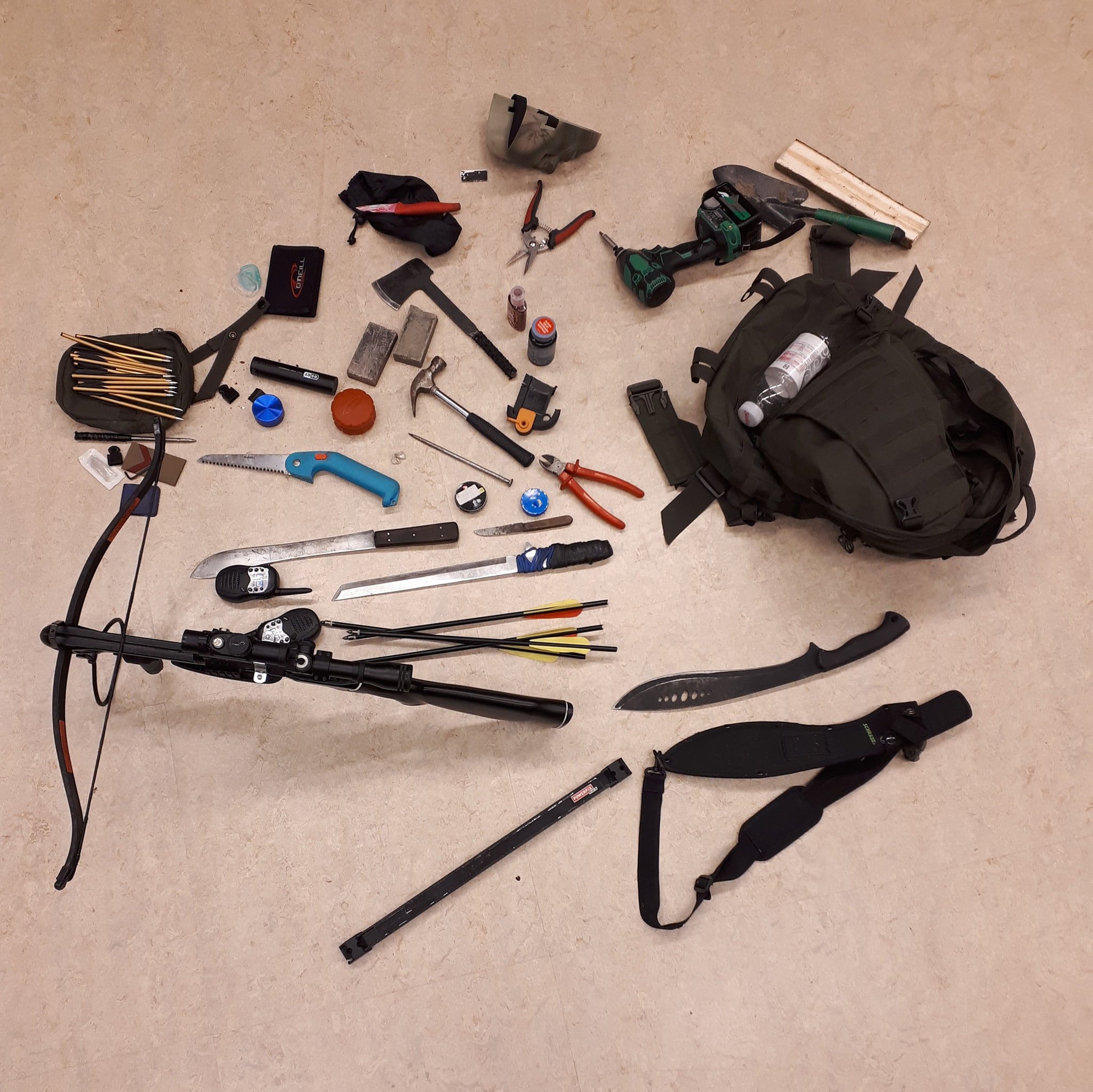 Heinenoord – Op donderdagavond heeft de Politie na een melding een 20 jarige inwoner van Heinenoord aanhouden in zijn woonplaats. In zijn auto werd naast de kruisboog waar de melding over ging, een heel arsenaal aan messen, pijlen etc aangetroffen.