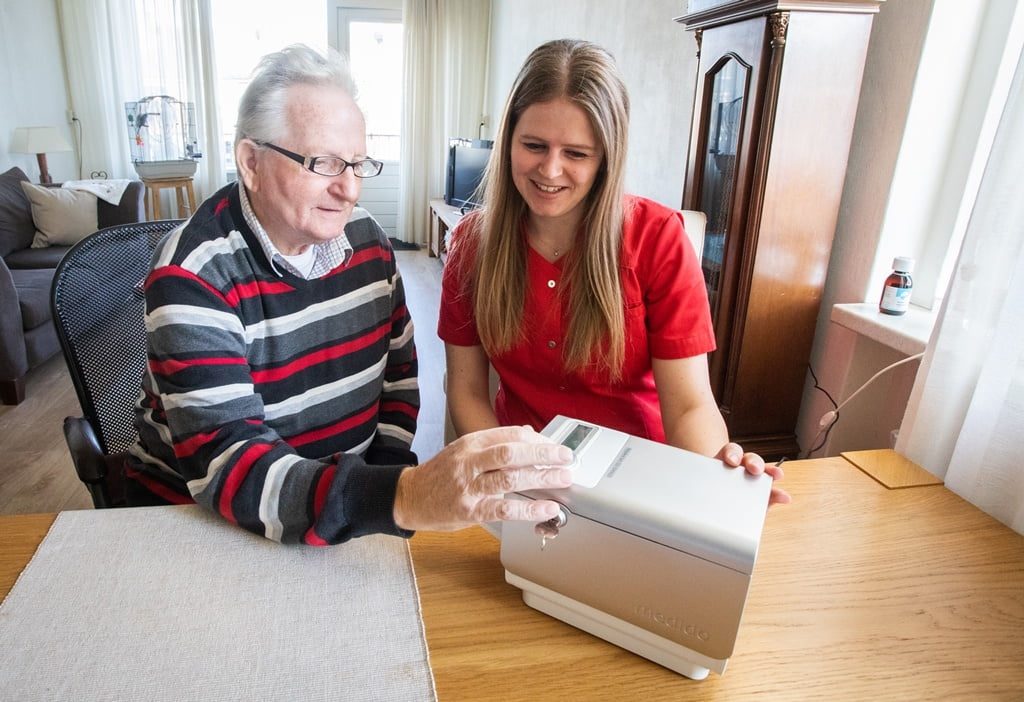Een slimme medicijndispenser is simpel gezegd een elektronische medicijndoos die een geluidssignaal laat horen als het tijd is medicatie in te nemen en deze medicijnen meteen aanbiedt. Meneer Verkuijlen uit Oud-Beijerland is de eerste thuiszorgcliënt in regio Hoeksche Waard die sinds enkele weken naar volle tevredenheid gebruik maakt van dit nieuwe type medicijndispenser. ‘Ik had het snel door hoe het werkte en ben erg enthousiast’, vertelt meneer Verkuijlen. ‘Ik raad het echt iedereen aan die het vervelend vindt afhankelijk te zijn van anderen voor het toedienen van medicijnen. Door de slimme medicijndispenser heb ik weer regie daarop gekregen. Dat voelt ontzettend goed.’