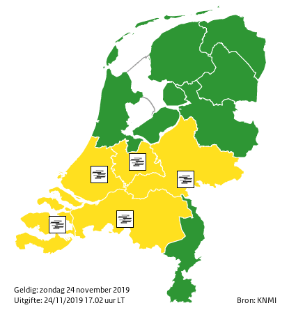HOEKSCHE WAARD – Het KNMI geeft zondagavond code geel af voor plaatselijk dichte mist. De waarschuwing geldt voor de provincies Zuid-Holland, Zeeland, Gelderland, Utrecht en Brabant. Ook in de gemeente Hoeksche Waard kan zondagavond en -nacht plaatselijk dichte mist ontstaan.
