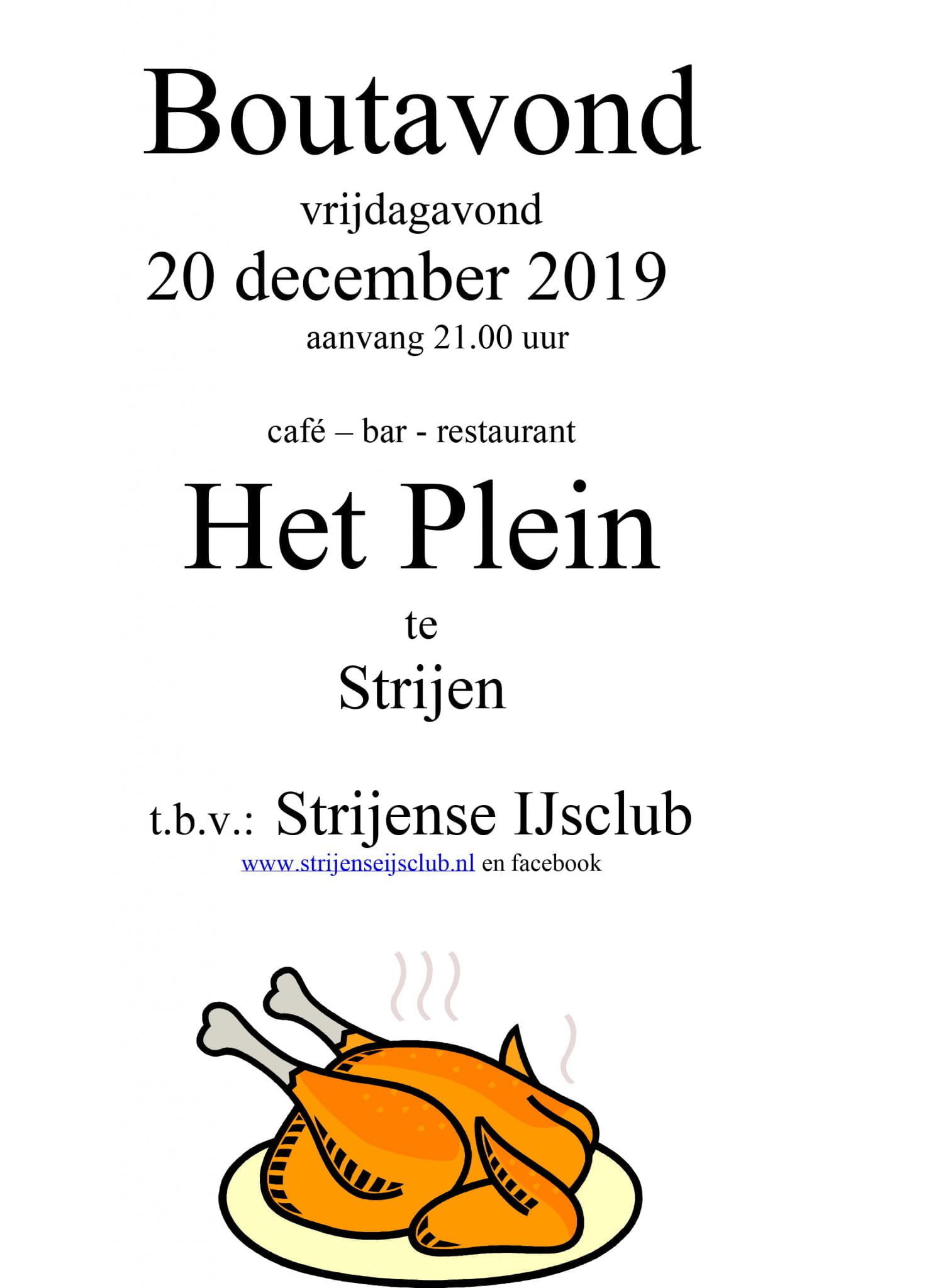 STRIJEN – Vrijdagavond 20 december is er weer de traditionele en supergezellige boutavond bij Café, Bar en Petit-Restaurant “Het Plein” in Strijen Aanvang: 21.00 uur.