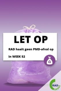 HOEKSCHE WAARD – De RAD haalt geen PMD op tijdens de kerstdagen. In WEEK 52 (23 t/m 27 december) zamelen ze geen PMD in. Het verzoek is die week daarom ook je zak niet aan de straat te hangen maar nog even thuis te houden.