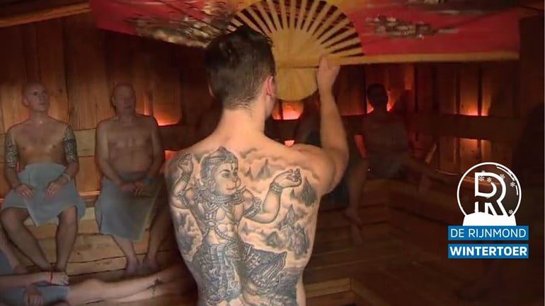“Ik zweet altijd wel, maar dit is echt extreem. Het is overheerlijk”, zegt een bezoeker. Hij is neergestreken in de sauna waar medewerker Patrick van Thermen net een opgieting heeft gedaan. “Ik heb net meerdere keren water op de stenen gegooid. Dat water is verdampt en heb ik rondgewapperd naar de mensen”, zegt hij terwijl hij met een ontblote bast en een indrukwekkende tatoeage op zijn rug de mensen toewuift.