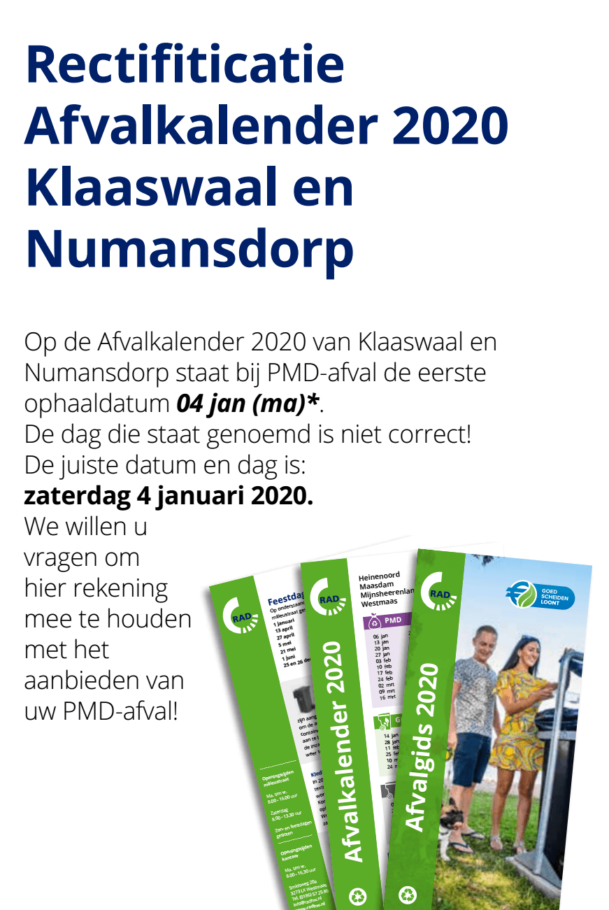 HOEKSCHE WAARD – Op de Afvalkalender 2020 van Klaaswaal en Numansdorp staat bij PMD-afval de eerste ophaaldatum 04 jan (ma)*De dag die staat vermeld is niet correct.