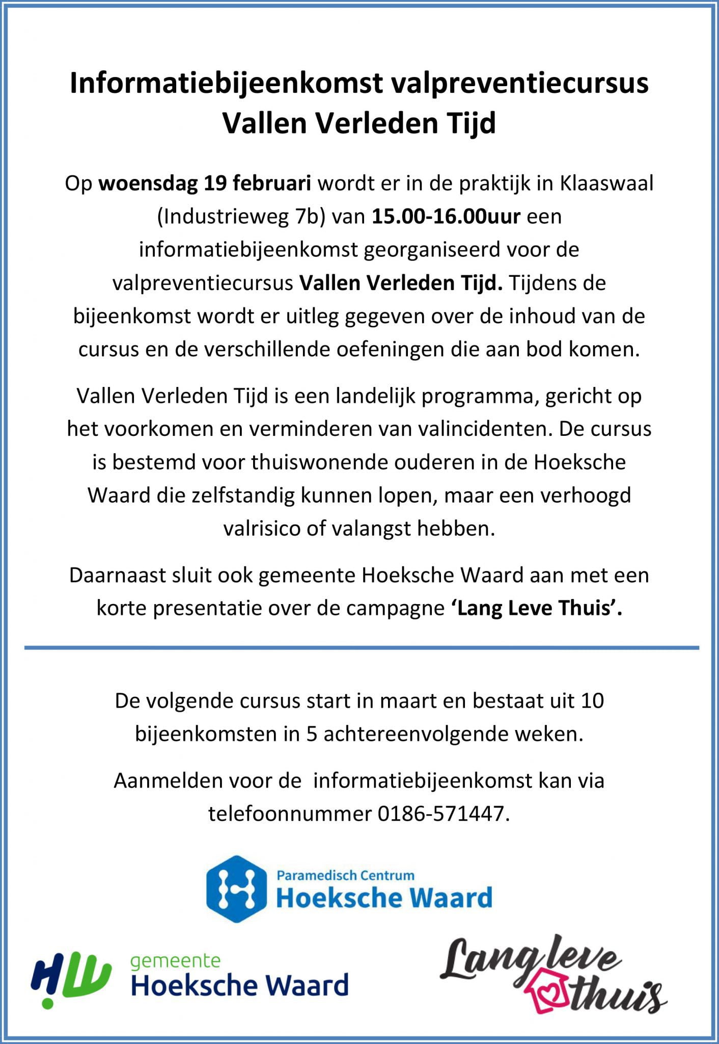 Klaaswaal – Op woensdag 19 februari wordt er in de praktijk van Paramedisch Centrum Hoeksche Waard in Klaaswaal van 15.00-16.00 uur een informatiebijeenkomst georganiseerd voor de valpreventiecursus Vallen Verleden Tijd.