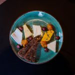 5 verschillende soorten kazen geserveerd met dadelcrème, abrikozencompote en kletzenbrood
