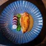 - Rilette van zeebaars, avocado crème, komkommer gember jus, parelcouscous, granaatappel en haringkaviaar.