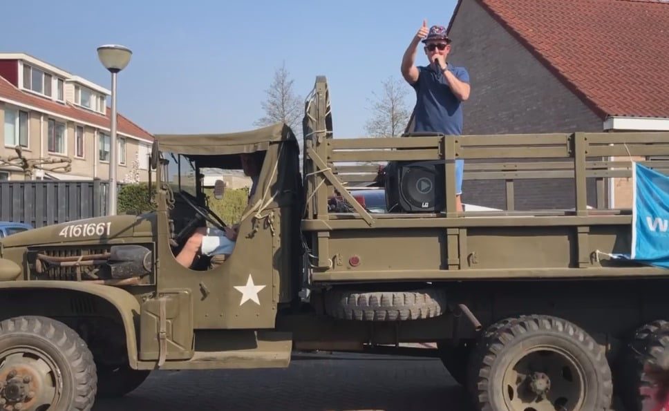 Klaaswaa l- De ogenschijnlijk onbekende Stichting ‘door’ Klaaswaal zette woensdagmiddag een bloemenactie op poten voor de inwoners van Klaaswaal. Een bos chrysanten met een paasgroet, onder begeleiding van muziek en zang om met name de oudere inwoners een hart onder de riem te steken in deze barre en eenzame tijden. Een DJ achterop een legertruck met muziek van toen, een aanhanger vol met bloemen en twee vreemd ogende aangeklede mensen met gevaartes van hoepels om afstand te houden.