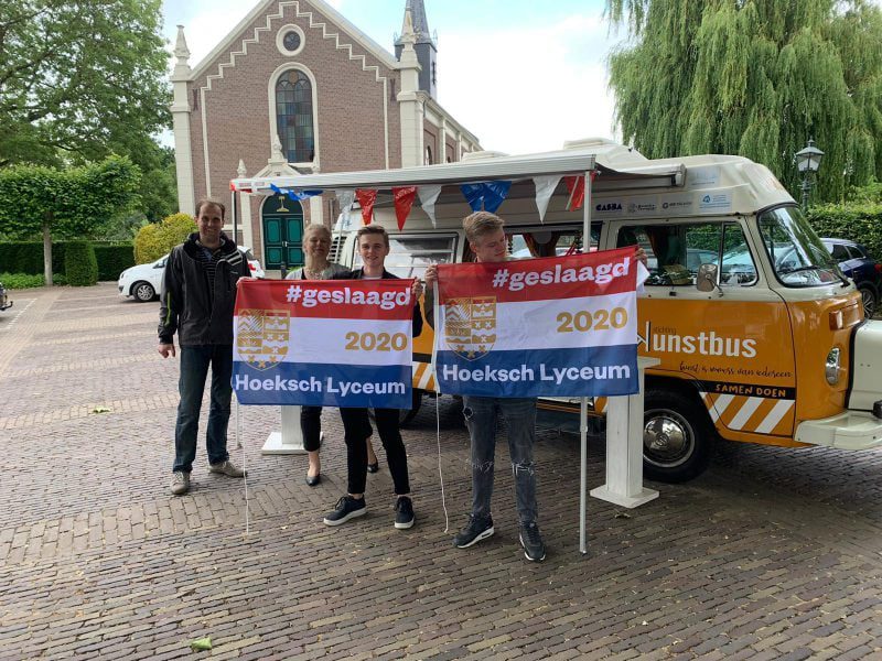 Omdat de leerlingen niet naar school mochten komen gingen de leerkrachten naar de leerlingen toe! Voor de mavo- en havo-leerlingen betekent dit dat de teamleiders en mentoren van de betreffende afdelingen of de examensecretaris hoogst persoonlijk thuis langs komen rijden om de leerlingen te feliciteren en de cijferlijst te overhandigen. Voor de vwo-leerlingen reed de Kunstbus rond in de Hoeksche Waard. Mevr. Beverwijk (mentor 6-vwo) bestuurde deze bus en deed samen met de teamleider alle Hoeksche Waardse dorpen aan bij een halte in het centrum. Leerlingen kregen daar feestelijk (en op gepaste afstand) hun cijferlijst uitgereikt.