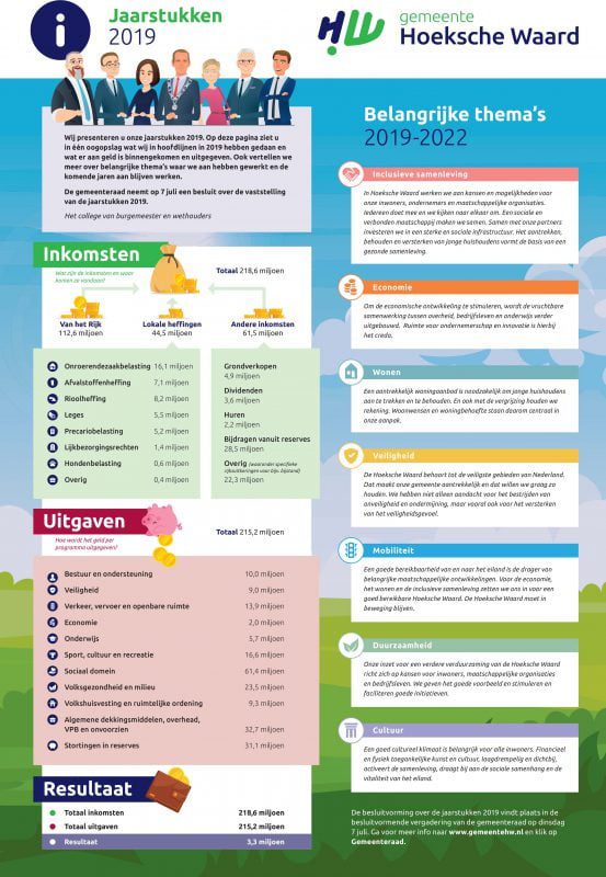HOEKSCHE WAARD – Het college van gemeente Hoeksche Waard presenteerde gisteren de eerste jaarrekening van de gemeente aan de gemeenteraad. De jaarrekening legt zowel beleidsmatig als financieel verantwoording af over 2019, het jaar waarin de basis van de nieuwe gemeente is gelegd. Wethouder Piet van Leenen (Financiën) is trots op het positieve resultaat van €3,3 miljoen waarmee het eerste jaar is afgesloten.