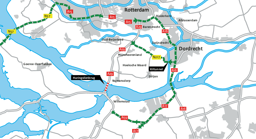 - De omleidingen voor het wegverkeer zijn langs en boven de weg aangegeven. Volg de gele borden. Omleidingsroutes gaan over de A59, A17, A16, en N57/A15.
