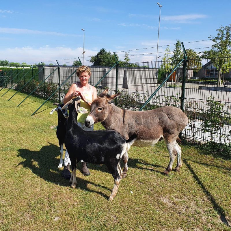 Inmiddels zijn de dieren helemaal gewend aan hun mooie, ruime onderkomen en genieten ze met volle teugen. Ook beheerder/vrijwilliger Pia van Dalen is heel blij met de nieuwe, grotere locatie. Ze verzorgt al bijna 20 jaar dagelijks de dieren van het geitenweitje. Dit doet ze samen met een paar vaste vrijwilligers (Gonny, Yolanda en Silvia) en in de vakanties en weekenden krijgt ze hulp van scholieren (Anne, Evelien en Noa). Pia: “We zijn er elke ochtend tussen 9.30 (zondag 10.00 uur) en 12.30 uur. Er komen regelmatig mensen – waaronder veel kinderen – een kijkje nemen. Ook komen er soms schoolklassen op visite. Ik vertel de kinderen dan over de dieren en ze kunnen ze door het hek aaien. Dat is heel erg leuk.” Pia wil graag de kinderboerderij nog een keer officieel openen, ook om alle vrijwilligers te bedanken, maar door corona wacht ze daar liever nog even mee.