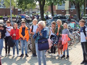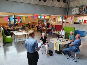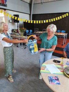 In verband met de Corona beperkingen werd er in kleine kring afscheid van haar genomen. De kinderen van de groepen 8 zongen haar buiten toe en binnen werd er gezellig geluncht met het team. Namens school en csg De Waard kreeg ze mooie en waardevolle cadeaus waaronder de nodige schoonmaakmiddelen met persoonlijke boodschap van alle kinderen en een vlaggenlijn van opgepimpte poetsdoekjes.
