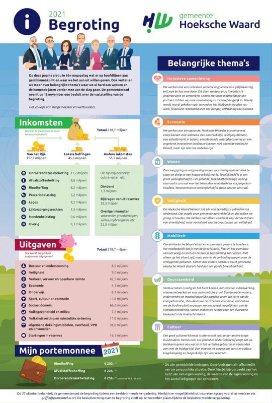Het college van gemeente Hoeksche Waard legt de gemeenteraad een sluitende begroting 2021-2024 voor. In deze begroting laat de gemeente zien wat de beleidsplannen voor de komende 4 jaar zijn, welke activiteiten hierbij horen en natuurlijk wat deze activiteiten gaan kosten.