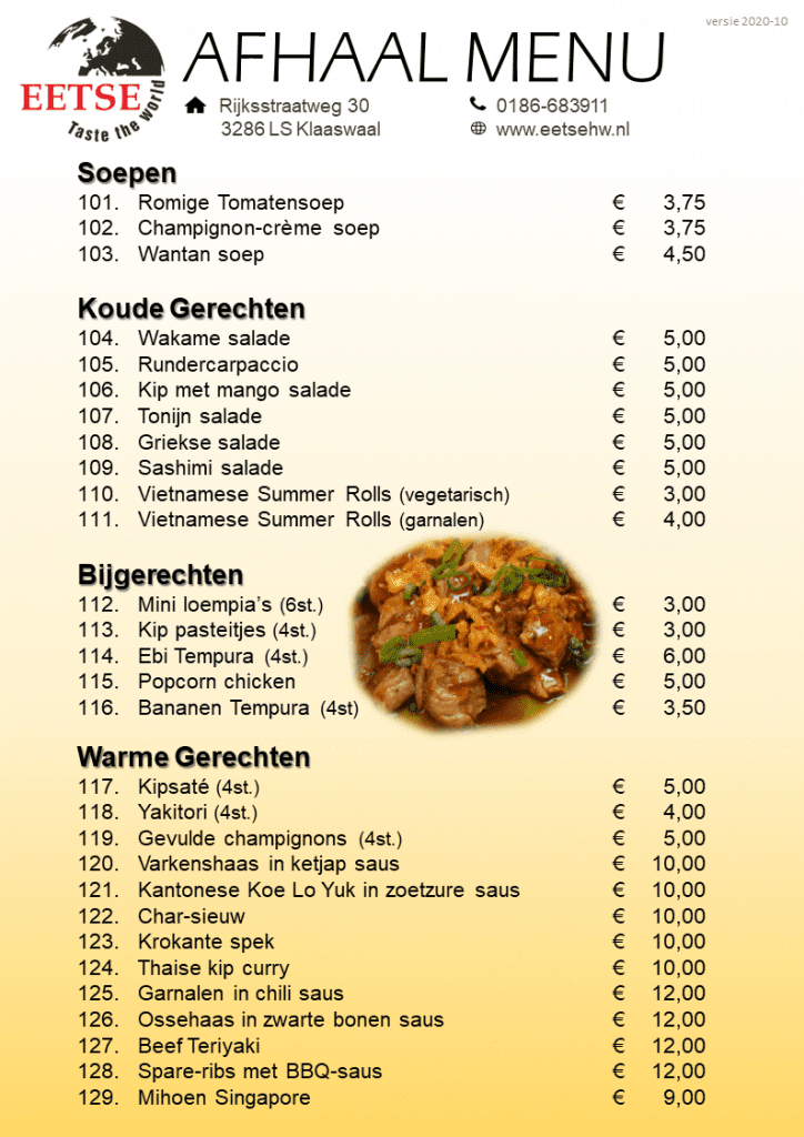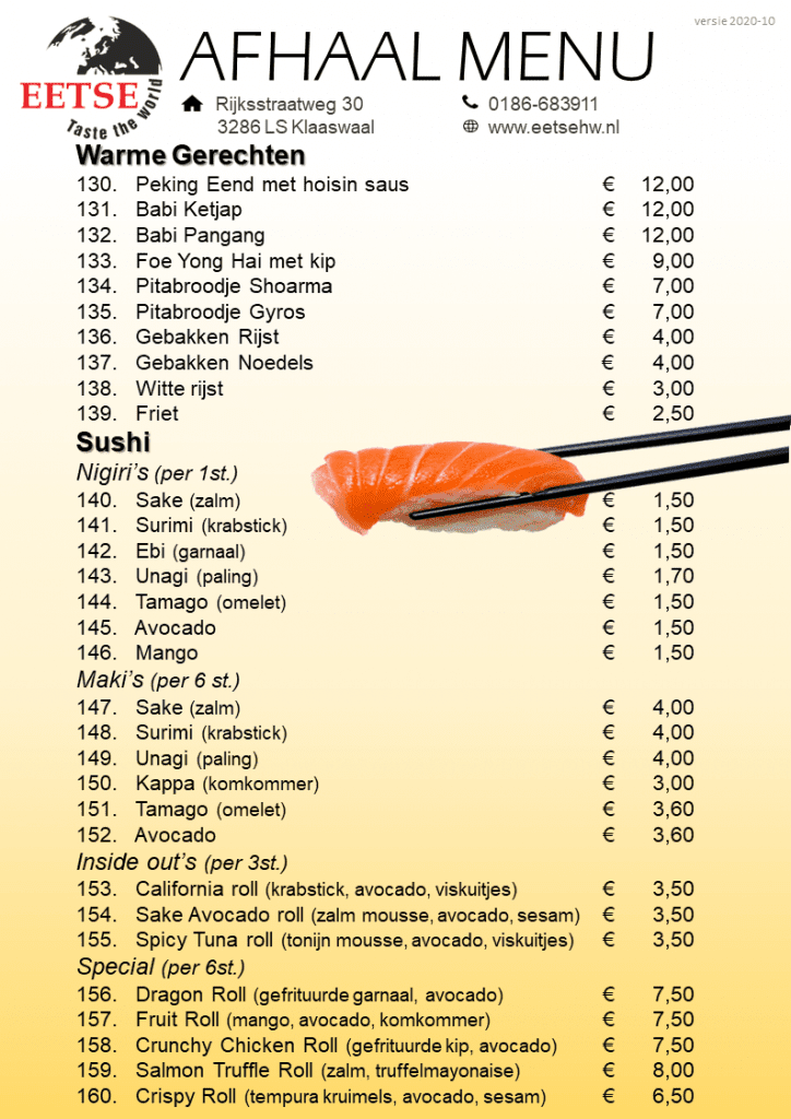 Afhalen kan vanaf 16:00 uur tot 20:30 uur, graag even uw bestelling doorbellen naar 0186-683911. U kunt ons vinden op de Rijksstraatweg 30 3286 LS Klaaswaal.