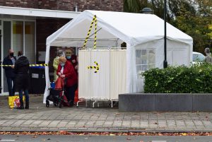 Nieuw-Beijerland – Bij de huisartsenpost Nieuw-Beijerland was men vanochtend druk bezig om een tent te plaatsen voor de ingang. Deze tent moet een coronaproof veilige griepprik straat garanderen.