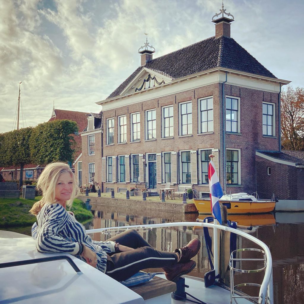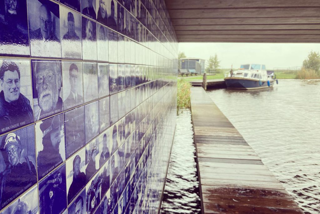 buitjes over me heen, maar als je dan de tegelbrug van de elfstedentocht in het landschap ziet verschijnen doet de regen je helemaal niks meer. ‘Wat een geweldig gevoel om die te bereiken, daar even aan te meren om hem voor de tweede keer van dichtbij te bewonderen en er dan onderdoor te varen. ‘Mijn droom is, naast het kruisje natuurlijk, dat mijn tegeltje daar ook komt te hangen. De achterkant van de brug is nog helemaal leeg’ Overal was het lekker rustig, buiten het seizoen, dus Caroline meerde aan op de mooiste plekjes in de elf steden. In Leeuwarden aan De Prinsentuin, bijna alleen, terwijl het in de zomer 3 dik lag met boten. In Sneek tegenover de watertoren. In Dokkum onder een van de molens, in Sloten onder de molen, waar maar 3 plekjes zijn. Daar meerde Rintje Ritsma ineens voor haar Doerak aan, hoe leuk als je de Elfstedentocht aan het varen bent. Toch een cadeautje als schaatsfan.