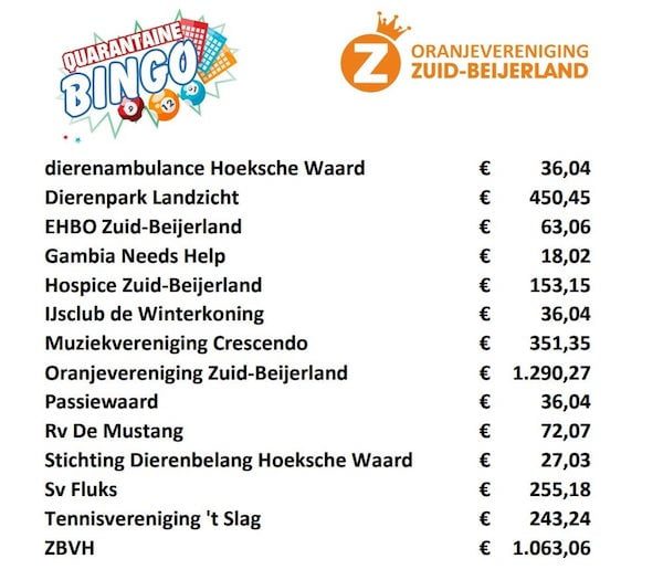 ZUID-BEIJERLAND – Oranjevereniging Zuid-Beijerland heeft de opbrenst bekend gemaakt welke door de deelnemers van de Quarantaine BingoShow bij elkaar is gespeeld.Er is onwijs enthousiast gereageerd op de mogelijkheid om de Zuid-Beijerlandse verenigingen/stichtingen te steunen.