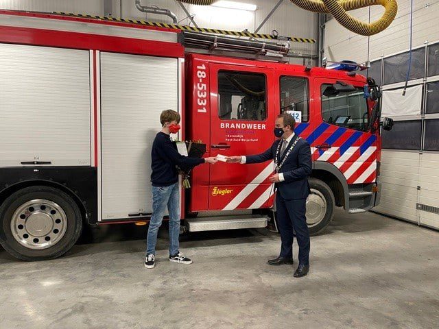 Dat gebeurde maandagavond, in de brandweerkazerne van Zuid-Beijerland. De burgemeester heeft respect voor Stefan, en dan met name dat hij op deze leeftijd bij zo’n actie “koel blijft en doet wat je moet doen”. De scholier van het Grafisch Lyceum Rotterdam kreeg voor zijn heldendaad een cadeaubon en een bos bloemen. Stefan heeft zijn reanimatiediploma behaald via de Jeugdbrandweer Korendijk, waar hij nu bijna 4 jaar lid is. Naast het onderdeel Brandbestrijding worden de jeugdbrandweerleden ook meegenomen in een stukje levensreddend handelen. Reanimeren is hiervan een onderdeel.